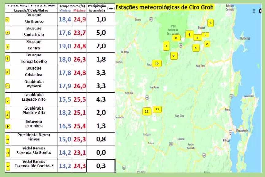 Março de 2020 está começando mais ameno em Brusque se comparado com os últimos anos. Os 2 primeiros dias do mês geraram uma temperatura média de apenas 21,8ºC.