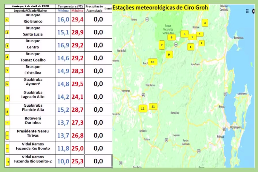 Com mais um final de semana ensolarado, Brusque atinge neste 5 de abril seu oitavo domingo seguido com tempo seco. A última vez que choveu de forma abrangente foi em 9 de fevereiro, quando naque domingo à tarde, o município sofreu as consequências de uma forte enxurrada.