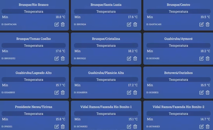 As temperaturas mínimas da madrugada de hoje tiveram uma oscilação entre 17 a 19ºC em Brusque. Pelo Vale do Itajaí-Mirim, Vidal Ramos ficou com o menor índice da região no período, marcando 14,7ºC na localidade de Fazenda Rio Bonito.