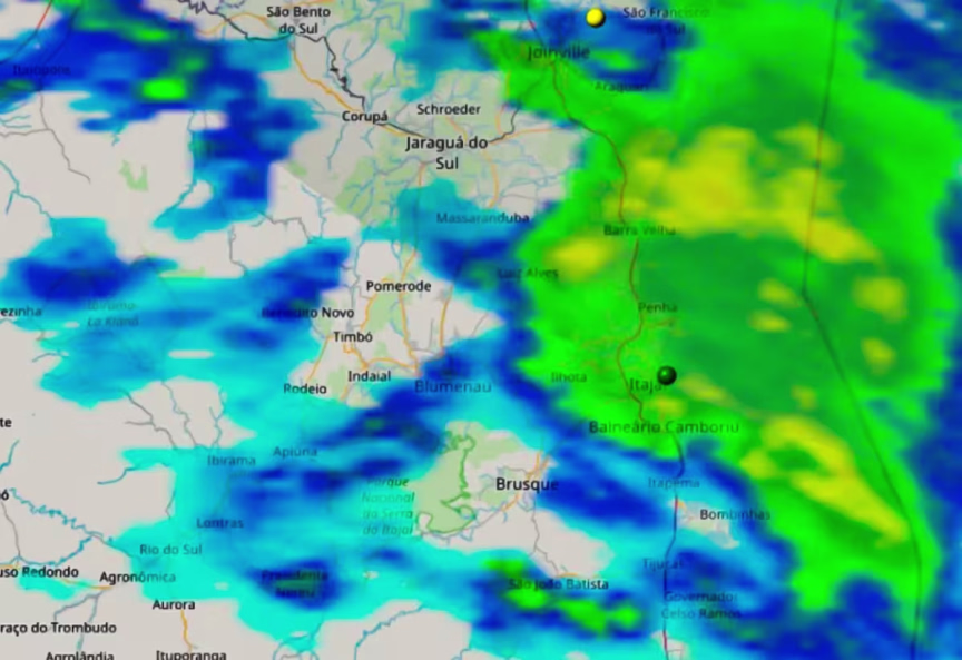 Abaixo temos a imagem do Radar da Aeronáutica, atualizada às 17h30 desta quarta-feira, onde podemos observar as instabilidades (em verde e amarelo) que provocaram chuva no Vale do Itajaí, se afastando rumo ao oceano: