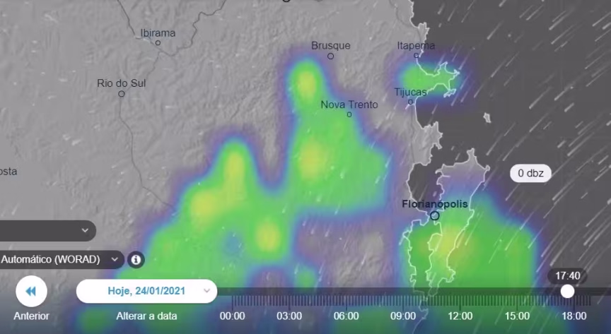 A seguir temos uma imagem de radar, atualizada às 17h40 deste domingo. Podemos observar mais chuva principalmente entre o entorno de Brusque, parte do Vale do Rio Tijucas, Alto Vale do Itajaí e Grande Florianópolis.