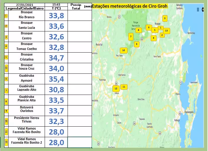 Confira abaixo os picos máximos desta quarta conferidos por todo o Vale do Itajaí-Mirim.