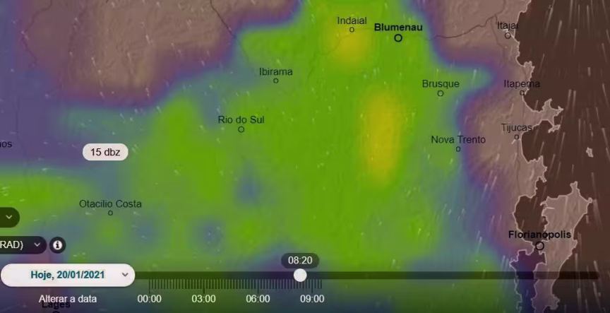 A seguir está a imagem do Radar Ventuski atualizada às 8h20 desta manhã de quarta-feira. Podemos observar a chuva presente no Vale do Itajaí, ilustrada nas manchas coloridas.