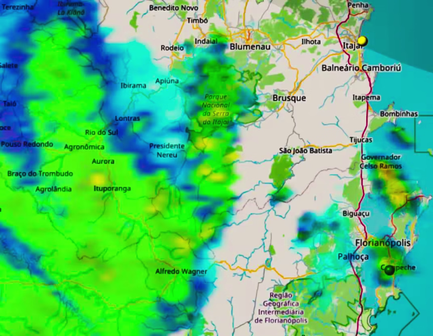Abaixo temos a imagem do Radar do Morro da Igreja, nos apresentando áreas com chuva no Vale do Itajaí e Grande Florianópolis nesta manhã de sexta-feira, atualização das 8h.