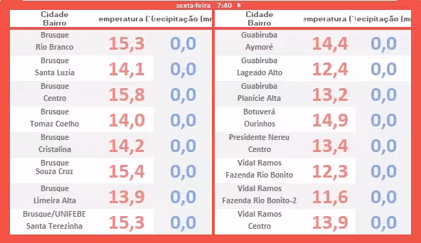 "Esta sexta-feira, 2, será marcada por mudança nas condições do tempo em toda SC. No Vale do Itajaí, algumas poucas aberturas de sol ocorrem na parte da manhã e a temperatura se eleva, com máximas projetadas entre 22 e 24°C".