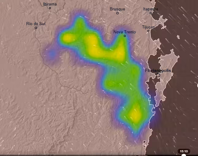 Nesse horário, era possível observar a chuva ainda presente em parte do Vale do Itajaí. Está ilustrada nas manchas em amarelo e verde da figura do mapa: