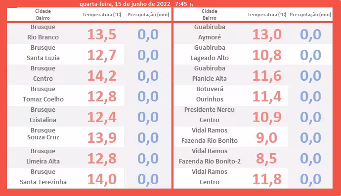 A semana chega à sua metade diante do frio mais forte perdendo intensidade na região brusquense. Veja como ficaram as temperaturas mínimas no amanhecer desta quarta: