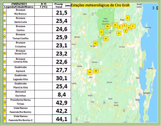 Podemos citar como exemplo, os 44 mm e 42 mm já assinalados no período em Vidal Ramos e Presidente Nereu respectivamente. Em Brusque, os valores variam 21 e 25 mm.