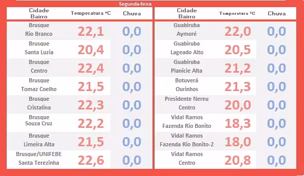 "Toda a região de Brusque segue na presença do tempo instável nos próximos dias, diante do ar quente e úmido ocasionando chuva, podendo acumular volumes representativos, sem hora definida para ocorrer, com condição maior entre tarde e noite, o que não impede algumas aberturas de sol".