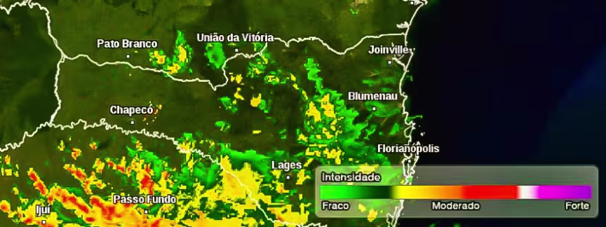 É possível notar a precipitação de fraca intensidade sobre o Vale do Itajaí naquele momento da atualização, mostrada nas áreas em verde. Já em amarelo, a intensidade se mostrava moderada e pontualmente forte em vermelho, mais no estado gaúcho.