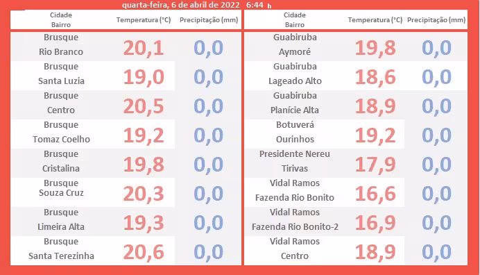 A tabela exposta abaixo vem mostrar o levantamento dos registros de temperaturas mínimas (em vermelho) assinaladas logo após ao romper da aurora de hoje. Não houve registro de chuva em nenhum local monitorado da região (em azul).