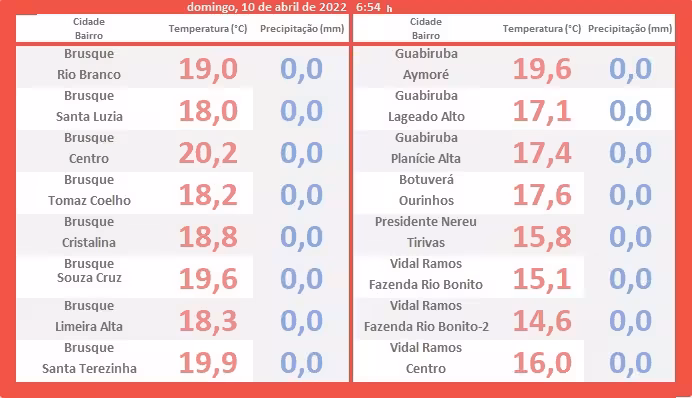 Confira o levantamento de dados exposto na tabela abaixo. Como podemos observar, não houve registro de precipitação em nenhum local monitorado da região até o amanhecer (em azul). Em anexo, veja também os índices mínimos aferidos pelos termômetros (em vermelho).