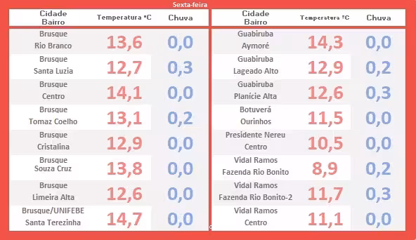 A tabela abaixo apresenta o registro das temperaturas mínimas observadas logo após o amanhecer desta sexta-feira (destacado em vermelho). Alguns locais tiveram ocorrência de chuva leve, anotada no período monitorado (indicado em azul).
