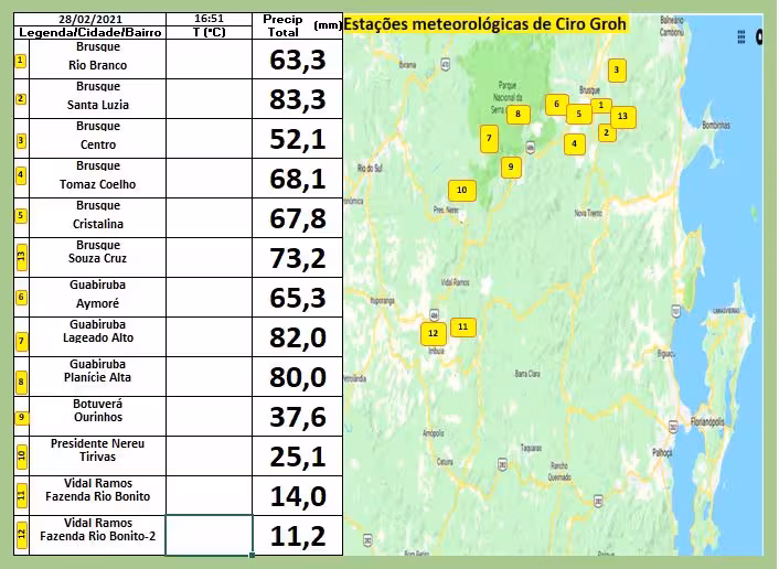 Confira abaixo a chuva conferida neste domingo em cada lugar descrito em anexo, do Médio ao Alto Vale. Dados apurados entre 0h e 16h51 deste domingo: