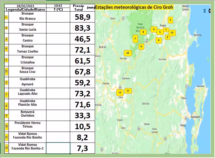 As três estações de monitoramento, instaladas em Vidal Ramos e Presidente Nereu, estão marcando índices entre 7 a 10 mm, dados coletados até 10h41.