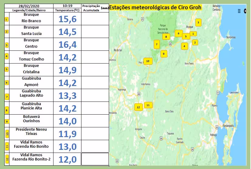 Pelo Vale do Itajaí-Mirim, Presidente Nereu ficou com a mínima da região, registrando 11,9ºC.