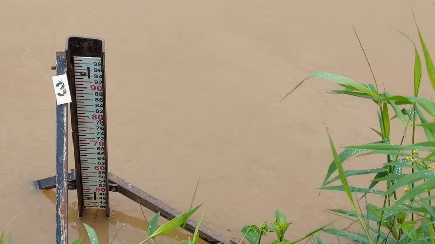 Seu nível, medido às 10h30, apresentava a marca de 2,41 metros na região central da cidade brusquense, como podemos observar na imagem capturada junto às réguas de medição, fixadas próximas à Ponte Estaiada: