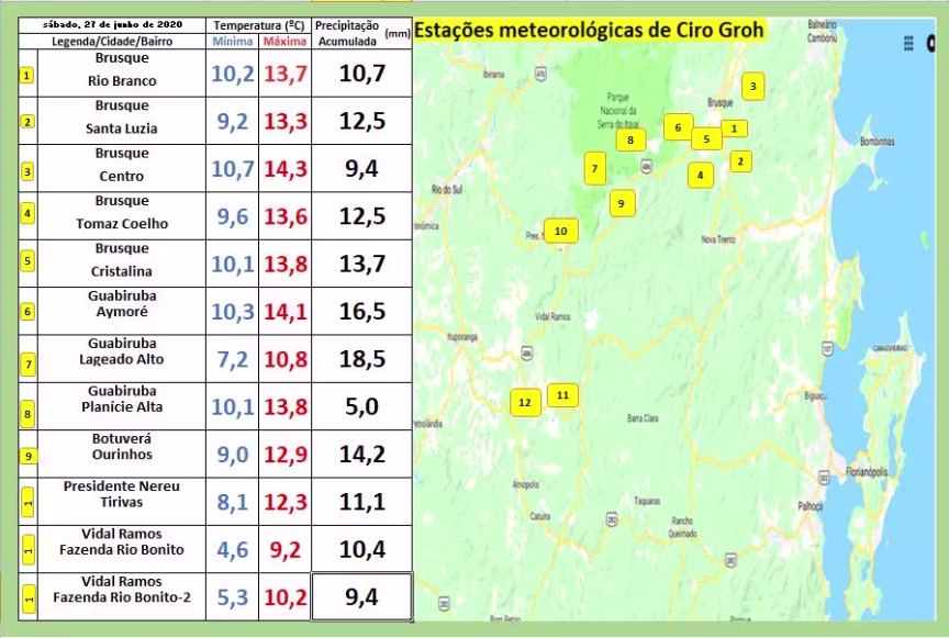 Situação parecida está sendo observada em Vidal Ramos, no entorno das nascentes nesse mesmo período. Minhas 2 estações de monitoramento instaladas na localidade de Fazenda Rio Bonito, apontam 9 e 10 mm somente.