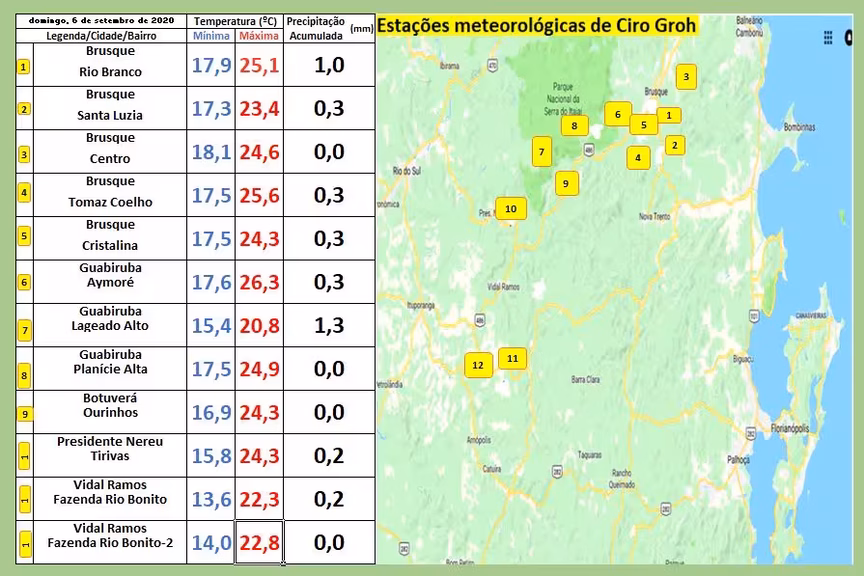 Segue abaixo os índices de temperaturas extremas (mínimas e máximas) registradas neste domingo no Vale do Itajaí-Mirim. Em anexo estão inseridos também, os volumes de precipitação nos locais de ocorrência: