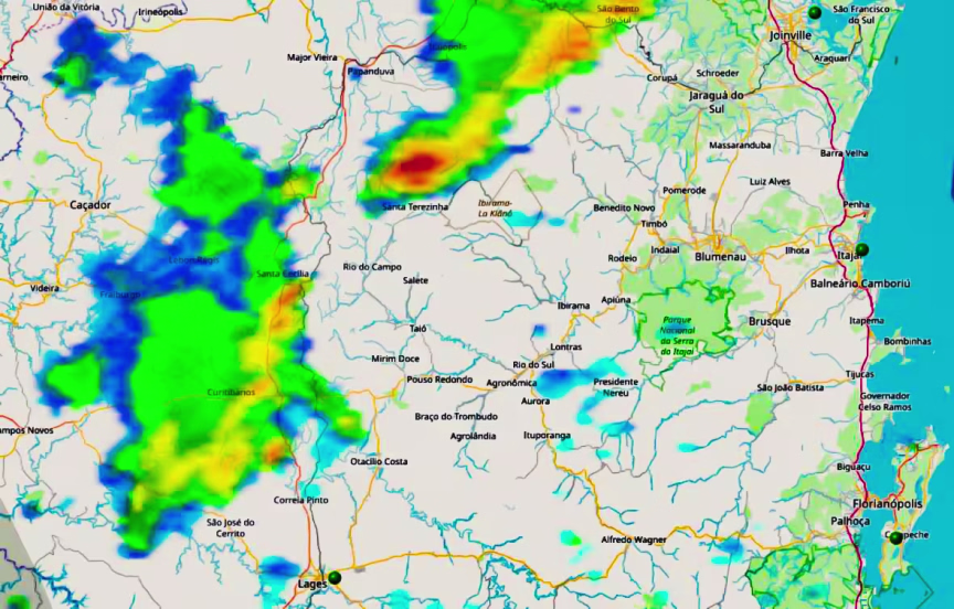 E a imagem de radar, atualizada às 16h30 apontava neste horário, alguns núcleos de chuva acompanhado por trovões, ilustrado nas manchas em vermelho da figura do mapa abaixo, por sinal, instabilidades ainda longe de Brusque.