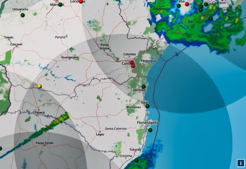 A seguir está a imagem do Radar da Aeronáutica, atualizada às 9h30. Podemos observar através das ilustrações, SC sem chuva. Instabilidades apenas detectadas no Sudeste do país, mostradas nas manchas em verde e amarelo da figura do mapa: