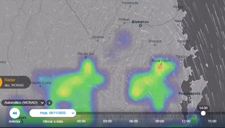 Na imagem de radar, atualizada às 14h, era possível observar nesse horário alguns núcleos de trovoada, ilustrados nas manchas coloridas da figura do mapa exibida a seguir, em especial, sobre a cidade de Nova Trento e arredores: