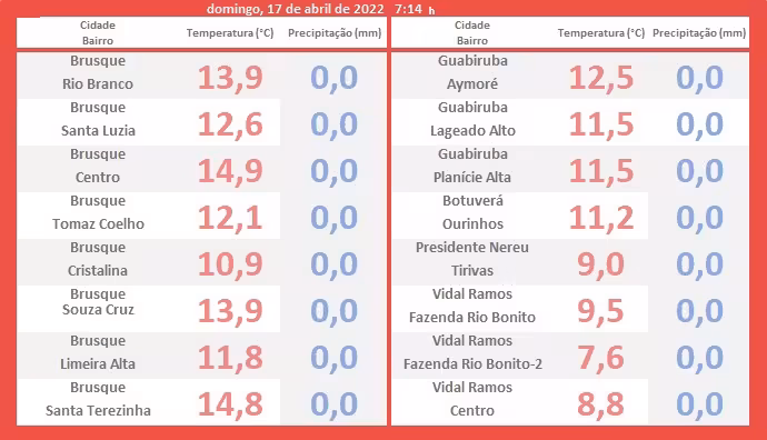 Confira na tabela abaixo os índices mínimos aferidos pelos termômetros (em vermelho) logo após o romper da aurora. Não houve registro de chuva em nenhum local monitorado da região (em azul).