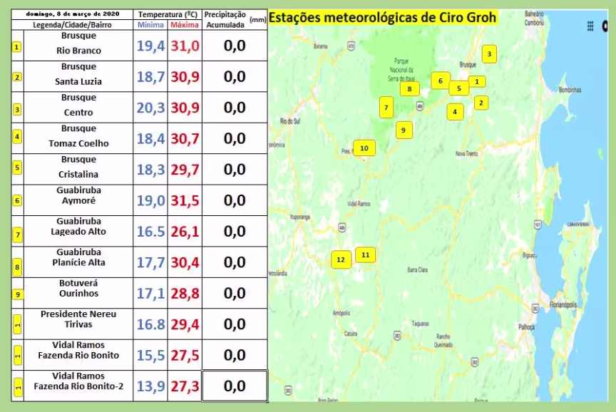O domingo, 08, dos brusquenses registrou calor no município, com picos acima dos 30ºC à tarde, a citar o bairro Rio Branco, onde os termômetros mediram 31,0ºC às 14h19.