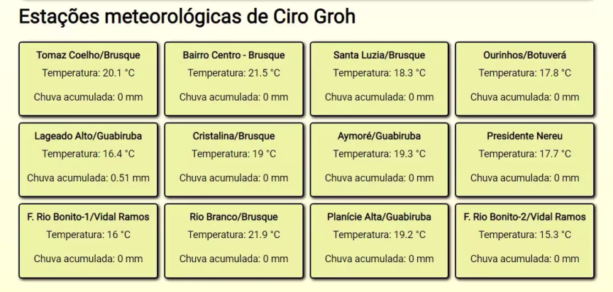 Já nesta outra tabela está a relação das temperaturas medidas na região do Vale do Itajaí-Mirim às 18h20 deste domingo:
