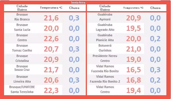 A tabela exposta abaixo mostra o levantamento das temperaturas mínimas pontuadas logo após o romper da aurora (em vermelho). Saiba também onde e quanto choveu no período, até o amanhecer (em azul).