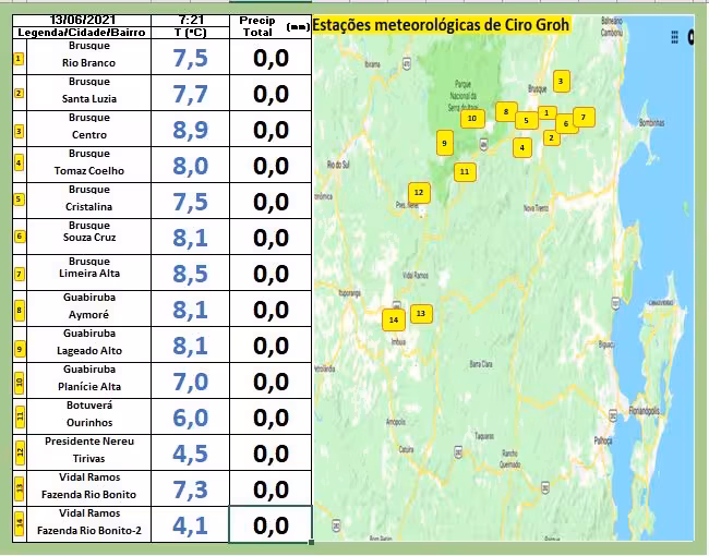Vale observar que esta não foi a madrugada mais fria do ano. As mínimas atuais foram superadas pelo amanhecer de 3 de maio, quando na ocasião, Brusque amanheceu marcando 4 a 6ºC.