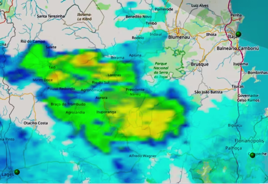 Confira abaixo a imagem do Radar da Aeronáutica, atualizada às 20h45, onde podemos observar a precipitação mal distribuída, presente nos municípios do Alto Vale, ilustrada nas manchas coloridas da figura do mapa.