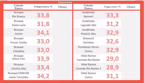 Confira no levantamento exposto na tabela abaixo, quanto que cada local descrito em anexo anotou de temperatura máxima nesta quarta-feira. Os dados em anexo derivam da rede Groh Estações.