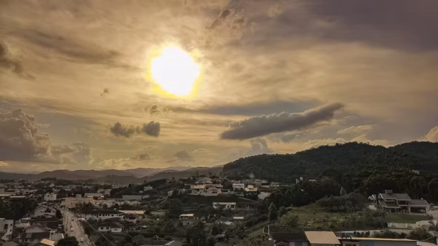 E Brusque não fugiu à regra, que a partir da tarde teve o brilho do sol sendo ofuscado pela maior presença das nuvens, culminando com pancadas de chuva de caráter bem pontual e isolada, acompanhadas de alguns trovões.
