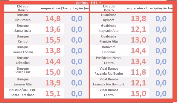 A tabela apresentada abaixo mostra o resultado do levantamento das temperaturas mínimas pontuadas na região logo após o romper da aurora (em vermelho). Não houve registro de chuva até o amanhecer (em azul). Os dados inseridos correspondem a cada local descrito em anexo.