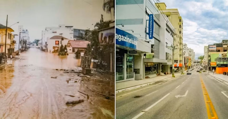 Confira abaixo uma comparação de fotos entre os mesmos locais, vividos na trágica enchente de agosto de 1984 com os cenários atuais observados em Brusque.