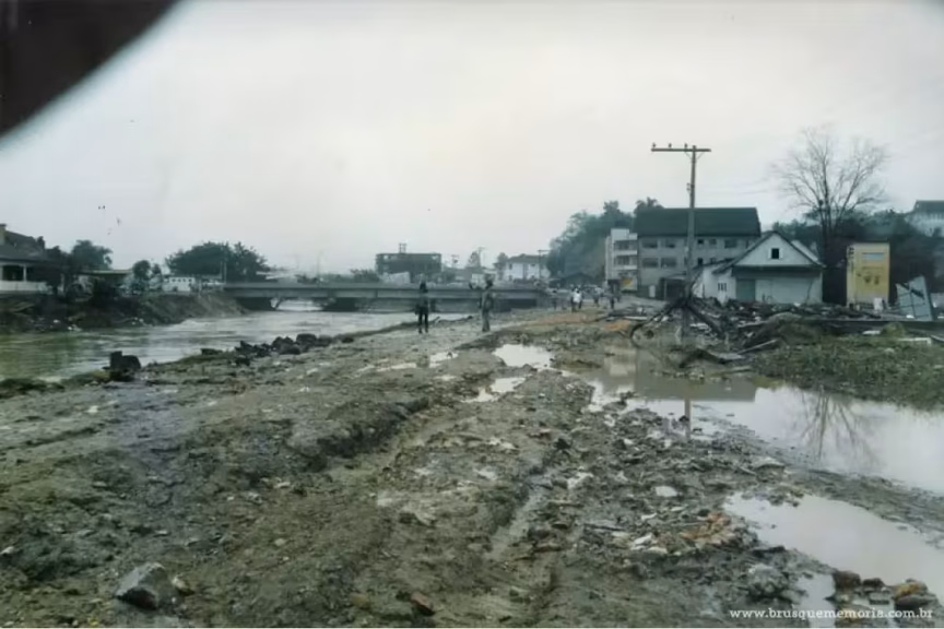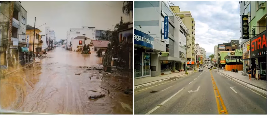 Confira abaixo uma comparação de fotos entre os mesmos locais, vividos na trágica enchente de agosto de 1984, com os cenários atuais observados em Brusque.