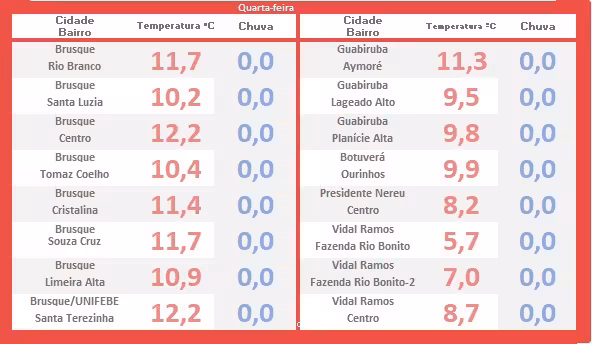 Apresentamos abaixo a tabela com o registro das temperaturas mínimas pontuadas logo após o amanhecer. Fez frio na região (destaque vermelho).