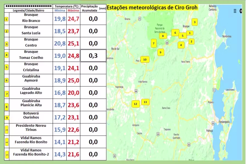 De acordo com dados extraídos nos meus 12 locais de monitoramento, o bairro onde mais choveu neste período do mês foi o Santa Luzia, em Brusque, com o acumulado já chegando a 273 mm.