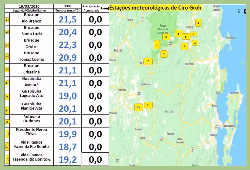Abaixo temos a tabela, onde estão inseridos os valores mínimos medidos pelos termômetros de minhas estações na madrugada desta quinta-feira, em seus respectivos locais descritos em anexo: