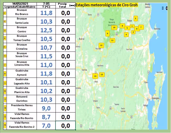 Confira abaixo como ficaram as temperaturas mínimas assinaladas por todo o Vale do Itajaí-Mirim ao amanhecer desta sexta-feira:
