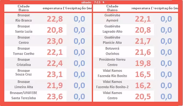 Antes da exibição do boletim, vamos apresentar a tabela contendo o levantamento das temperaturas mínimas conferidas por toda a região brusquense entre a madrugada e o amanhecer deste sábado (em vermelho). A apuração mostra também, ausência de chuva no período observado (em azul).