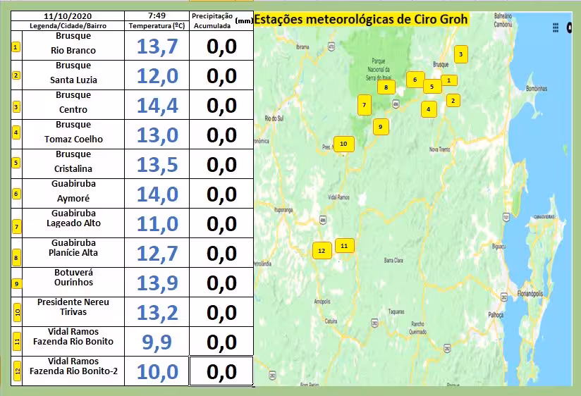 Pelo Vale do Itajaí-Mirim, os moradores da localidade de Fazenda Rio Bonito, em Vidal Ramos, começaram o dia no frio de 9ºC. Em Guabiruba, o bairro Lageado Alto marcou 11ºC.
