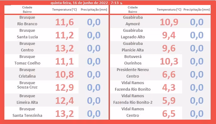 Vamos dar sequência à edição desta quinta-feira, destacando agora, o tempo monitorado no Vale do Itajaí-Mirim na madrugada e amanhecer. A tabela abaixo mostra as temperaturas mínimas pontuadas logo após o romper da aurora.