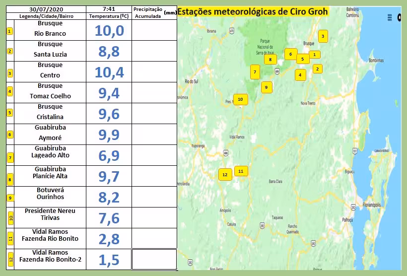 Abaixo estão inseridos na tabela, os valores mínimos registrados no Vale do Itajaí-Mirim entre a madrugada e amanhecer de hoje: