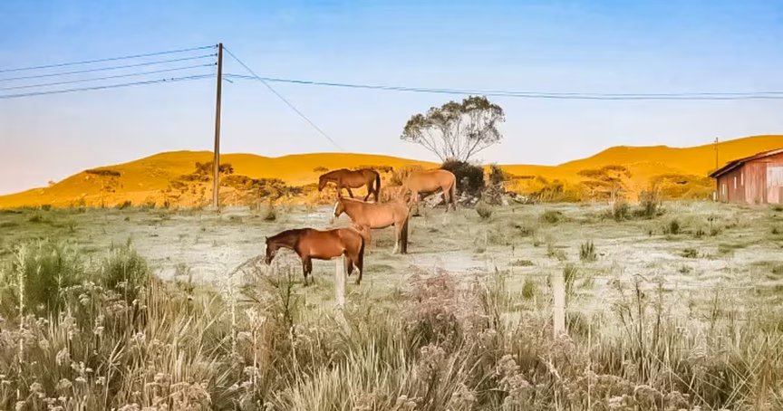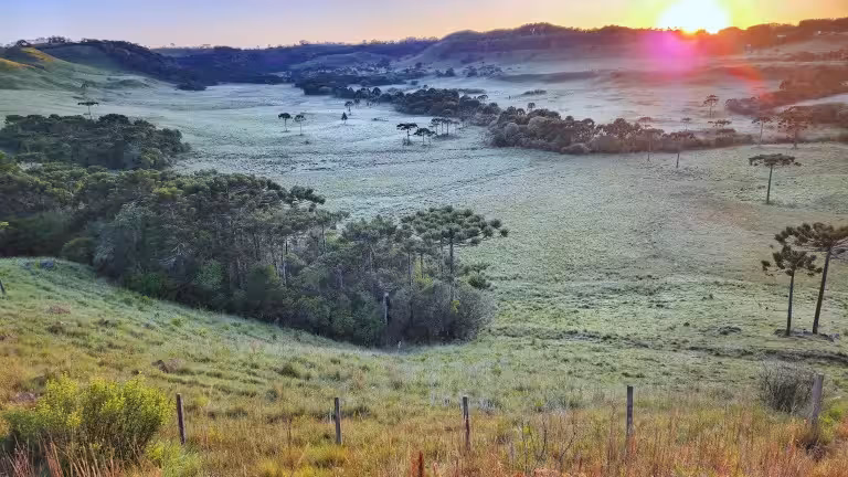 Na comunidade do Vale do Caminhos da Neve, situada a 3km do centro de São Joaquim, a geada provocou um espetáculo à parte, com dos campos pintados de branco, propiciando a imagem da paisagem dourada diante do nascer do sol.