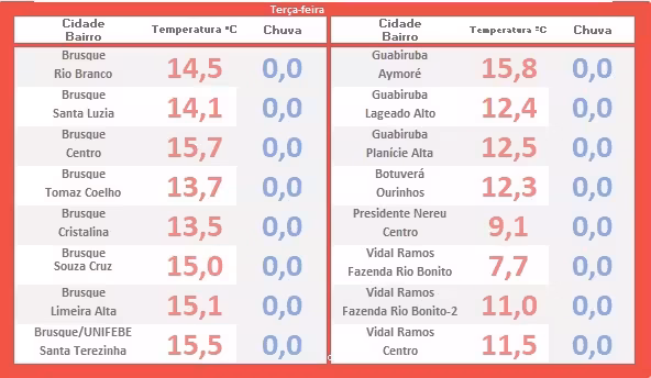 Essa condição estável prevista para hoje também se estende à quarta-feira, sem previsão de chuva nas cidades do Vale do Itajaí. Os termômetros permanecem num patamar elevado, com picos próximos aos 30ºC durante a tarde.