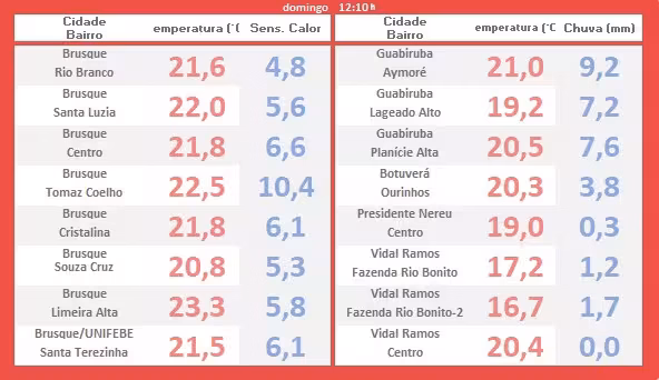 A tabela exibida mais abaixo vem mostrar as temperaturas amenas para esta época do ano registradas por volta de 12h, horário que normalmente costuma ser o mais quente do dia. Os índices correspondem a cada local mencionado em anexo (em vermelho).