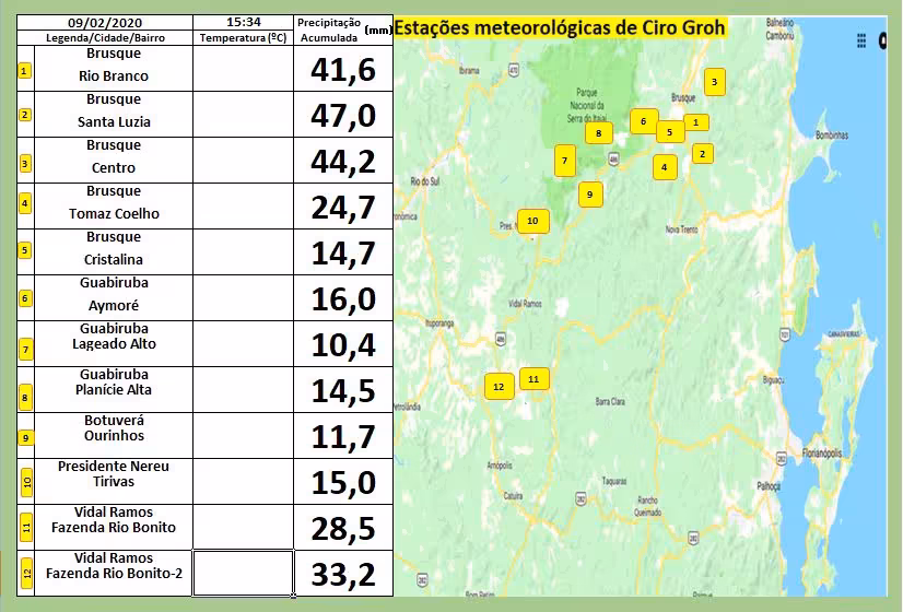 Confira quanto choveu no Vale do Itajaí-Mirim há exatamente um ano, em seus respectivos locais descritos em anexo: