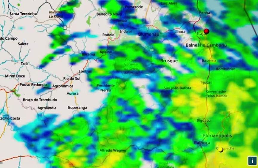 Em Brusque a precipitação somada em 48 horas apresenta números entre 13 a 14 mm pelos bairros do município.